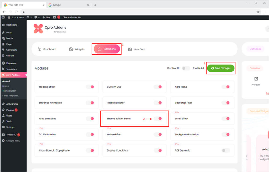 Go to the ‘Extensions’ tab and simply turn on the ‘Theme Builder Panel’ option. Finally, click on the ‘Save Changes’ button to update your settings.