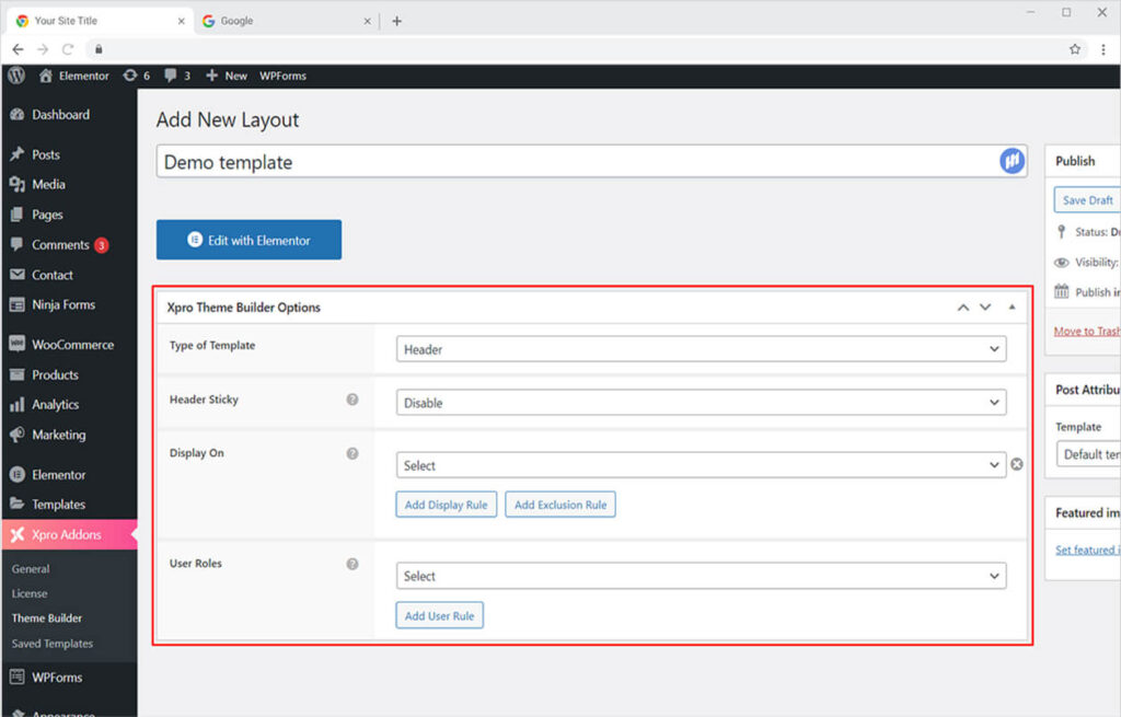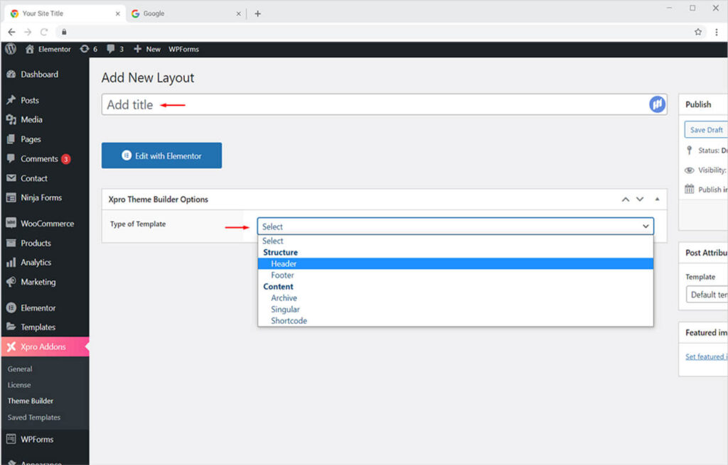 Click on the ‘Add New’ button to create a new layout. Simply enter the name of the new layout from the ‘Add Title’ option and choose the type of template from the ‘Xpro Theme Builder Option’.