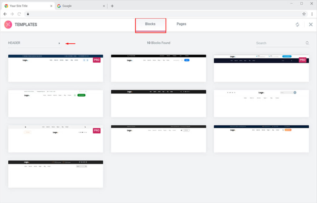 You can also choose any of our pre-built header layouts from the Xpro library by clicking the Xpro icon from the Elementor editor. Once clicked, you will see multiple block templates, simply click on the filter option and choose ‘Header’. You will see all pre-built header layouts for Elementor.