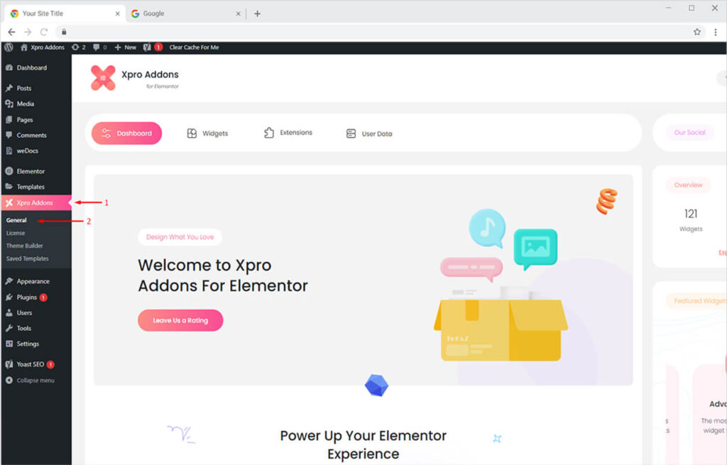 First, you need to enable the frontend theme builder panel from the Xpro Addons dashboard. To do this, simply login to your WordPress dashboard and open the ‘General’ tab option available on the sidebar.