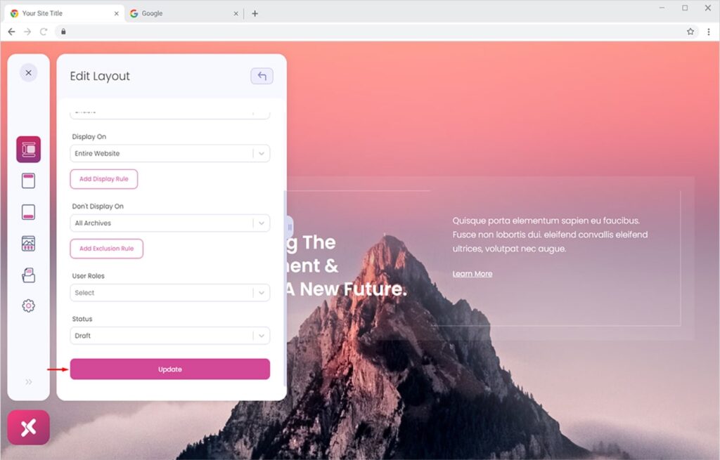 Here we can change the title of our layout and assign it to any site part. Here I have assigned it to the Header part from the Type option. You can set your header layout as Sticky, assign specific Display Conditions, and set User Roles.